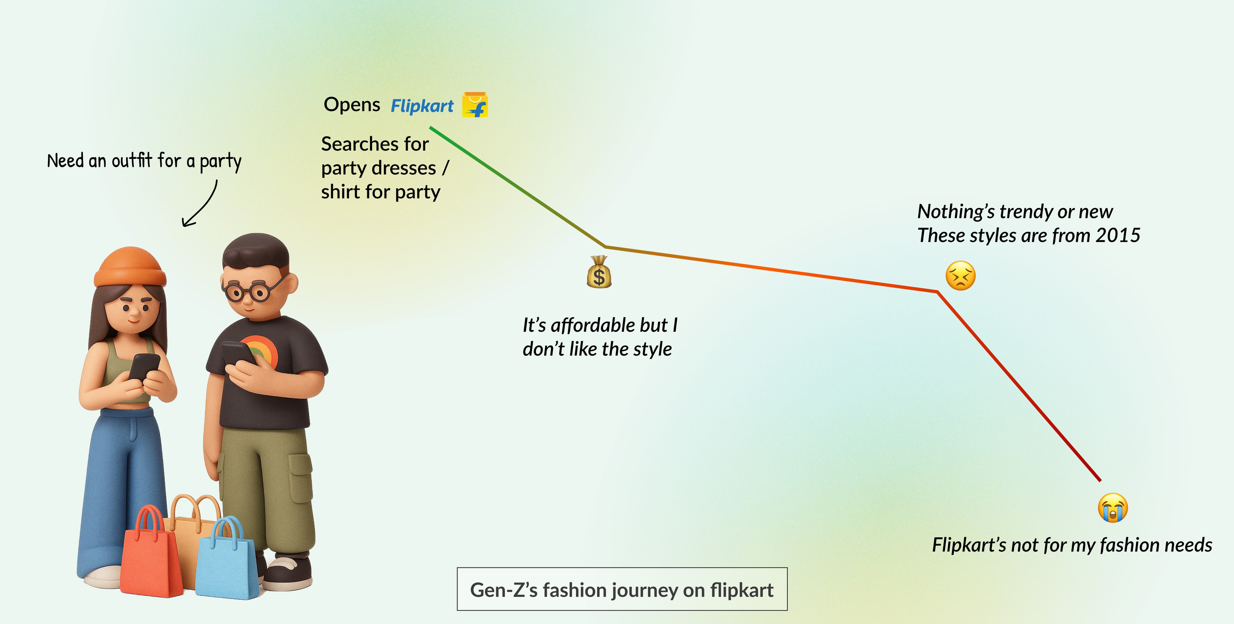 We defined Indian GenZ as users born between 1997–2007 across metro, tier 1, 2 and 3 cities. They’re budget-conscious, trend-driven, and shop frequently. But Flipkart’s experience didn’t excite them—it felt outdated, lacking newness, curation, or personality.